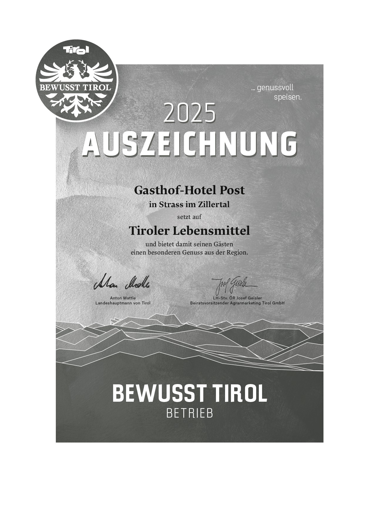 Im Jahr 2025 bekam das 4 Stern Gasthof Hotel Post in Strass erneut die Auszeichnung „Bewusst Tirol“. Der Einsatz von heimischen Lebensmitteln und die Stärkung der Zusammenarbeit von Tourismus und Landwirtschaft steht bei diesem Gütesiegel im Vordergrund. Die teilnehmenden Betriebe werden für ihren hohen Einsatz heimischer Produkte ausgezeichnet und sind somit Vorbilder für die regionsbewusste Tourismusbranche. Sie ist ein Wegweiser für Konsumenten und Gäste, die Tirol am Teller genießen möchten.